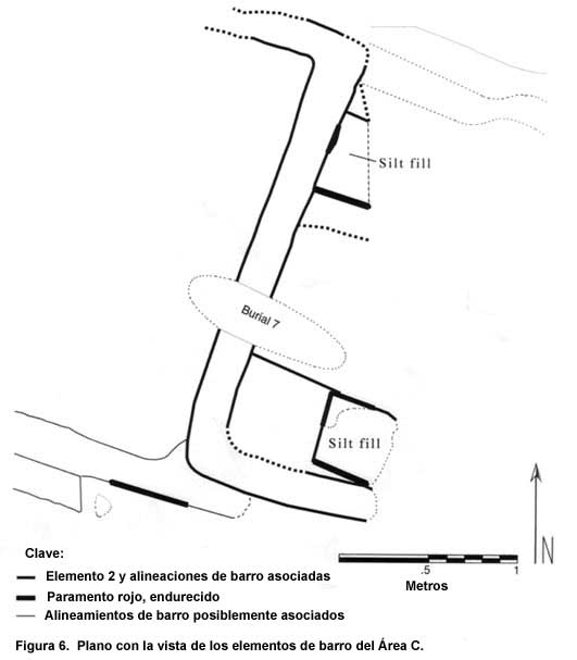 El contexto más temprano del Área C fue un grupo de elementos lineales hechos de tierra cocida y endurecida que pudo haber formado parte de una estructura (Figura 6). El mejor preservado fue el Elemento 2 de la Operación 1, un alineamiento de 2.5 m de largo y 21 cm de ancho de tierra cocida orientado a 15º/195º, perpendicular al eje longitudinal del montículo de Yugüe. En algunos lugares, una capa delgada de tierra roja endurecida al fuego cubría las superficies verticales del elemento (Figura 7, arriba). Fragmentos de otros cuatro elementos lineales corrían perpendicularmente al Elemento 2. Todos estaban alineados entre los 102º/282º y los 105º/285º, paralelos al eje longitudinal del montículo de Yugüe. Ninguno de estos alineamientos tenía piedras de cimiento por debajo. Sólo al este del Elemento 2 había varios fragmentos de una superficie de tierra compactada. Hay dos interpretaciones posibles para estos elementos. La primera es que representan los restos de un edificio del Formativo Terminal Temprano probablemente de carácter público dada su ubicación, forma, y tamaño. La segunda interpretación es que estos elementos eran para dar forma y contener el relleno que constituía el montículo del Formativo Terminal Temprano de Yugüe.